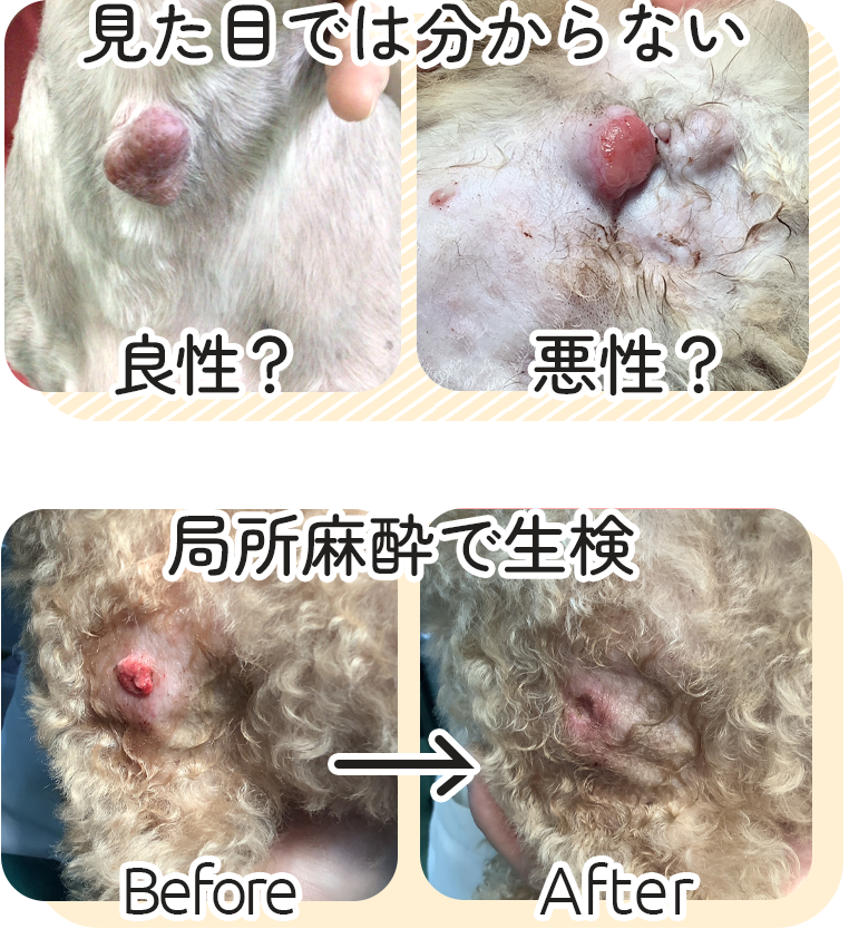 生検は局所麻酔で行えますが、腫瘍の場所によっては全身麻酔が必要になることもあります。早期発見・早期診断が治療の第一歩です。